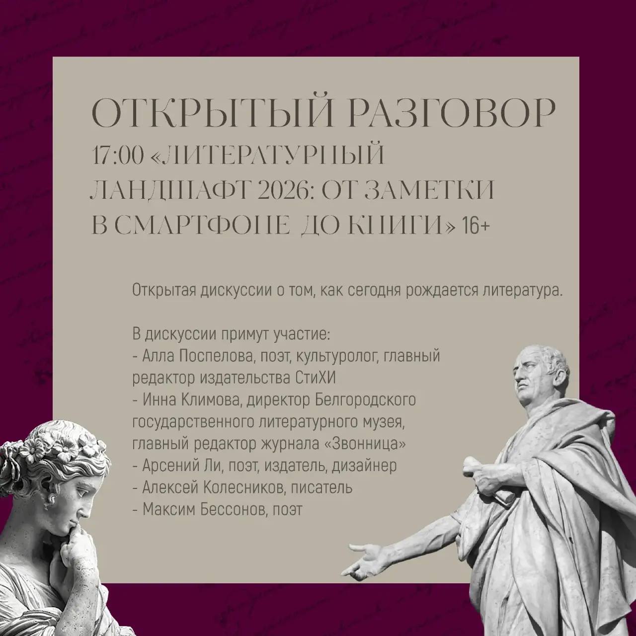 17.00 — Открытый разговор «Литературный ландшафт 2026: от заметки в смартфоне до книги».