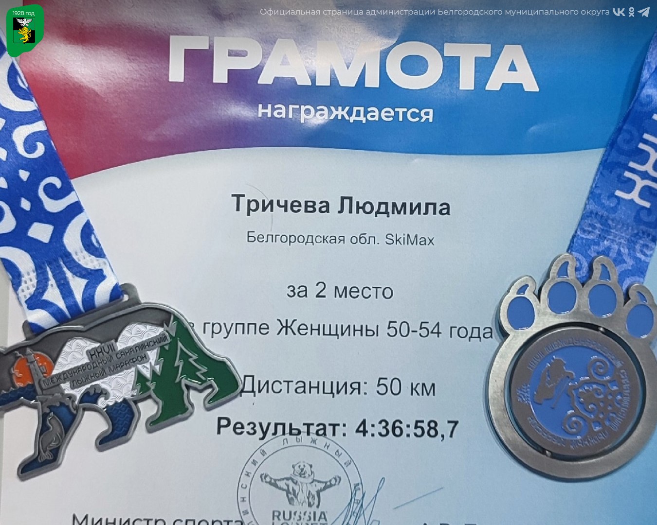 Людмила Тричева показала высокий результат, заняв второе место на дистанции 50 километров.