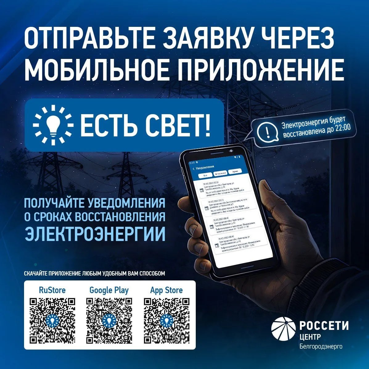 Мобильное приложение «Есть свет!». Установить его можно с помощью Google Play, App Store или RuЅtоге, отсканировав QR-код.