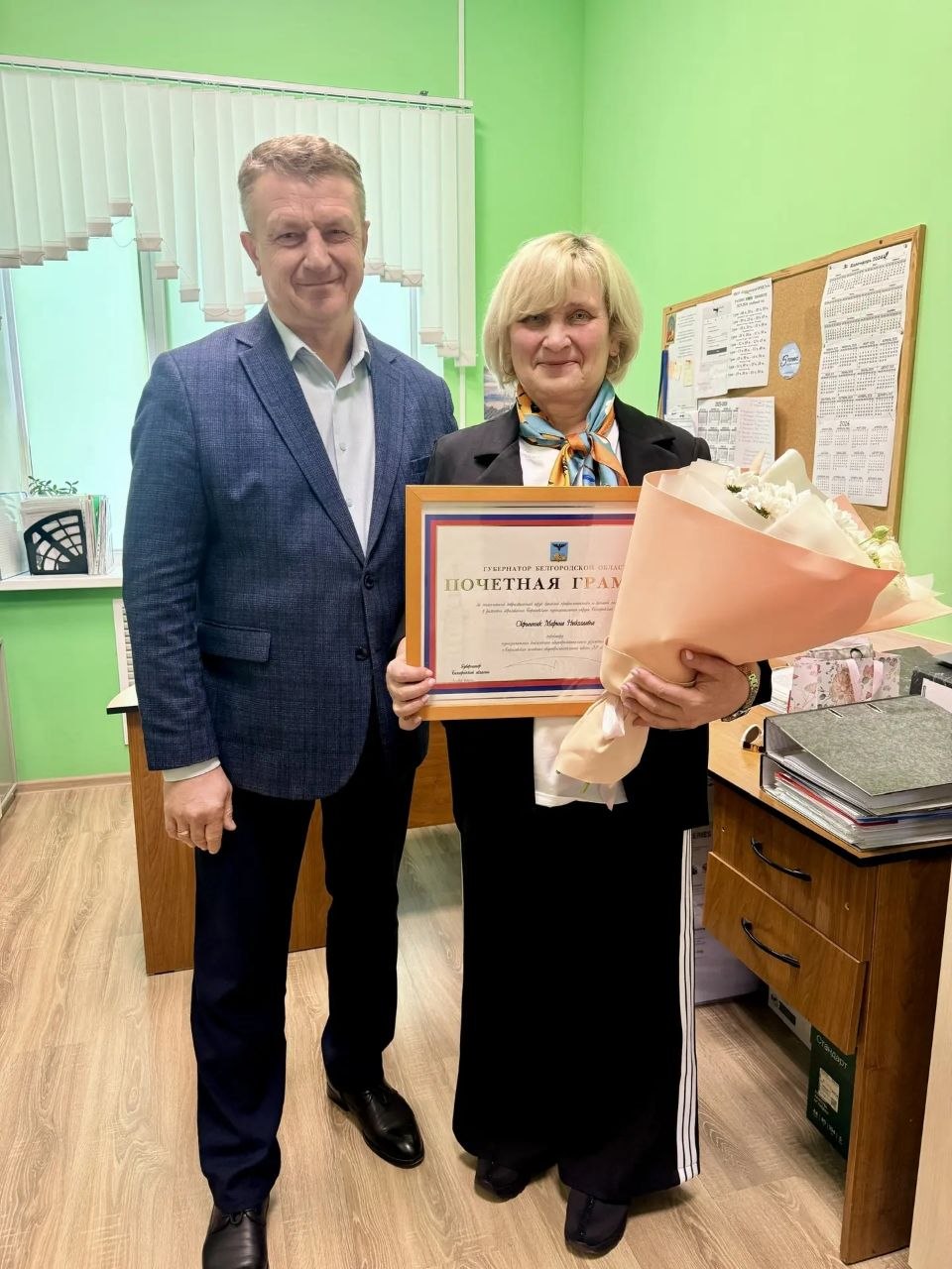 В этот знаменательный день мне выпала честь лично поздравить Марину Николаевну. Слова признательности адресованы не только ей как замечательному человеку, но и как руководителю, чей вклад в развитие образования нашего округа поистине неоценим. К моим поздравлениям и пожеланиям процветания вверенному ей учебному заведению, а также крепкого здоровья присоединилось и вручение высокой награды - Почетной грамоты губернатора Белгородской области.