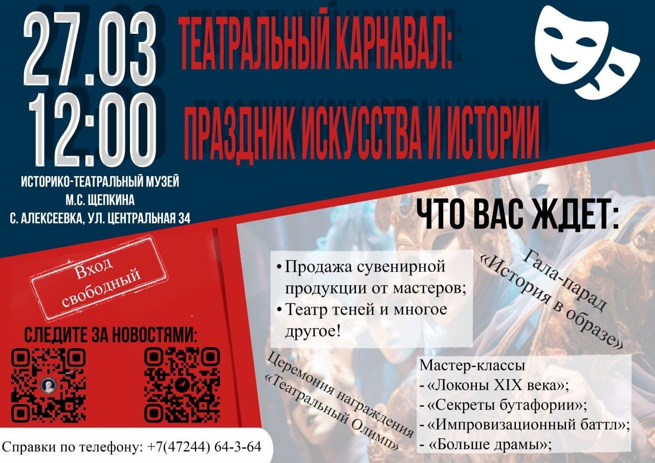 Историко-театральный музей М. С. Щепкина приглашает всех желающих в волшебное путешествие сквозь века — в мир театра, где оживают легенды, а история говорит голосом великих актёров!