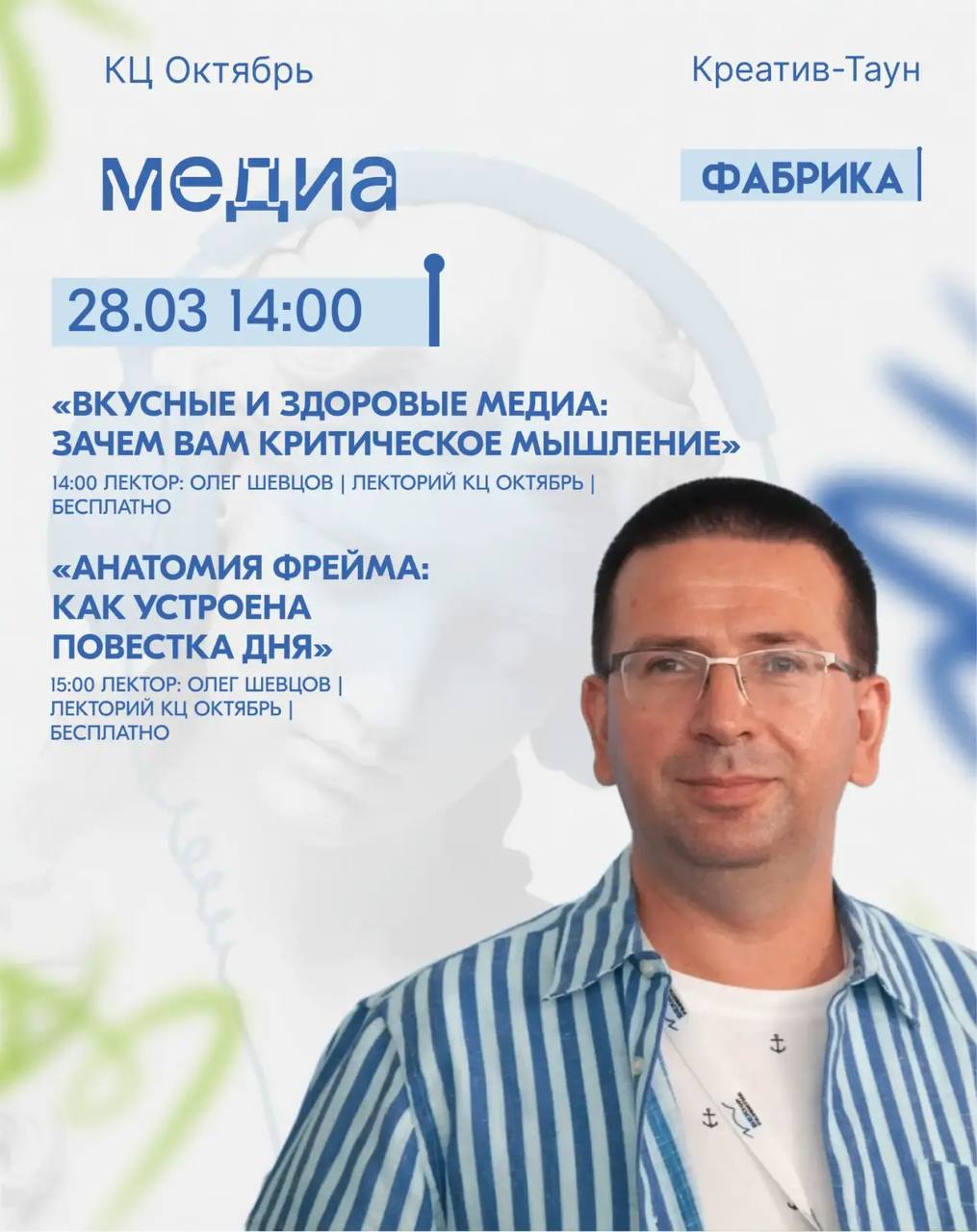 28 марта приглашаем тебя в лекторий КЦ «Октябрь», где с двумя лекциями выступит Олег Шевцов — шеф-редактор печатных СМИ компании «Медиацентр»:
