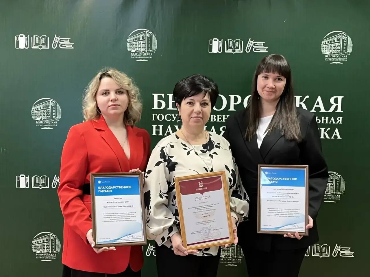 Заслуженную награду получила директор библиотечной системы Наталия Кудинова. Кроме того, Наталия Викторовна и ведущий библиотекарь модельной библиотеки с. Центральное Татьяна Голубовская отмечены благодарственными письмами управляющего белгородским отделением Банка России за значительный вклад в повышение доступности финансовых услуг и финансовой грамотности населения области в рамках совместного проекта «Сельский кабинет доступности финансовых услуг».