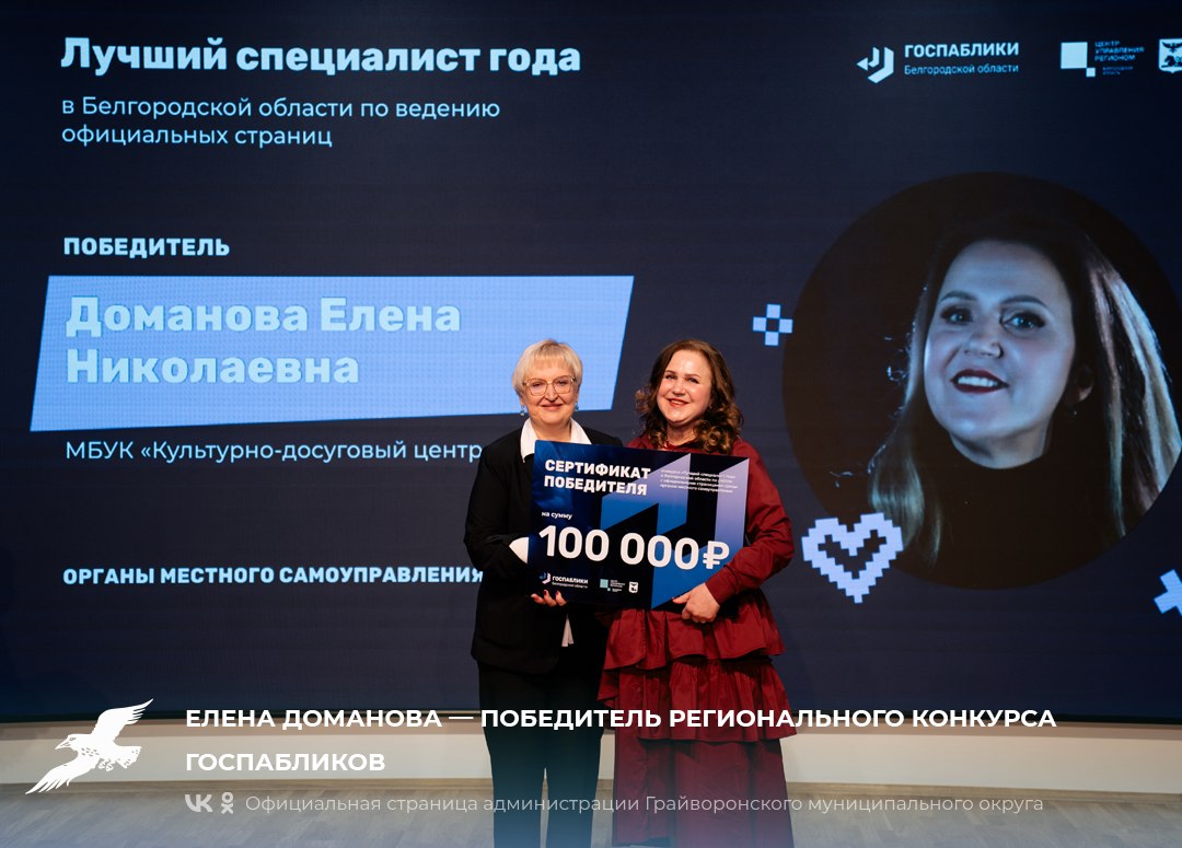 Елена Доманова, директор организационно-методического центра Грайворонского округа, одержала победу в номинации «Госпаблики муниципальных учреждений культуры и дополнительного образования» и получила премию в размере 100 тысяч рублей.