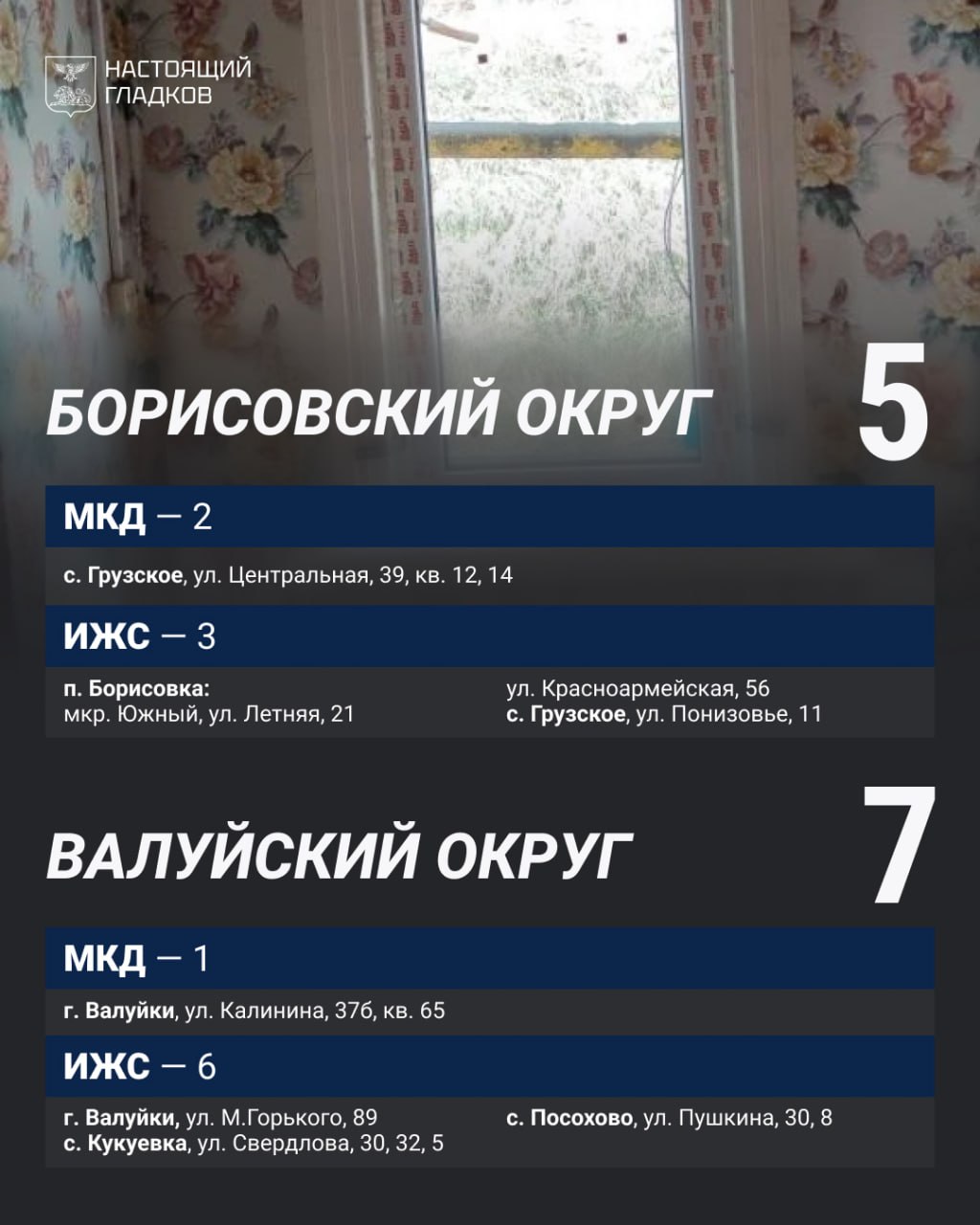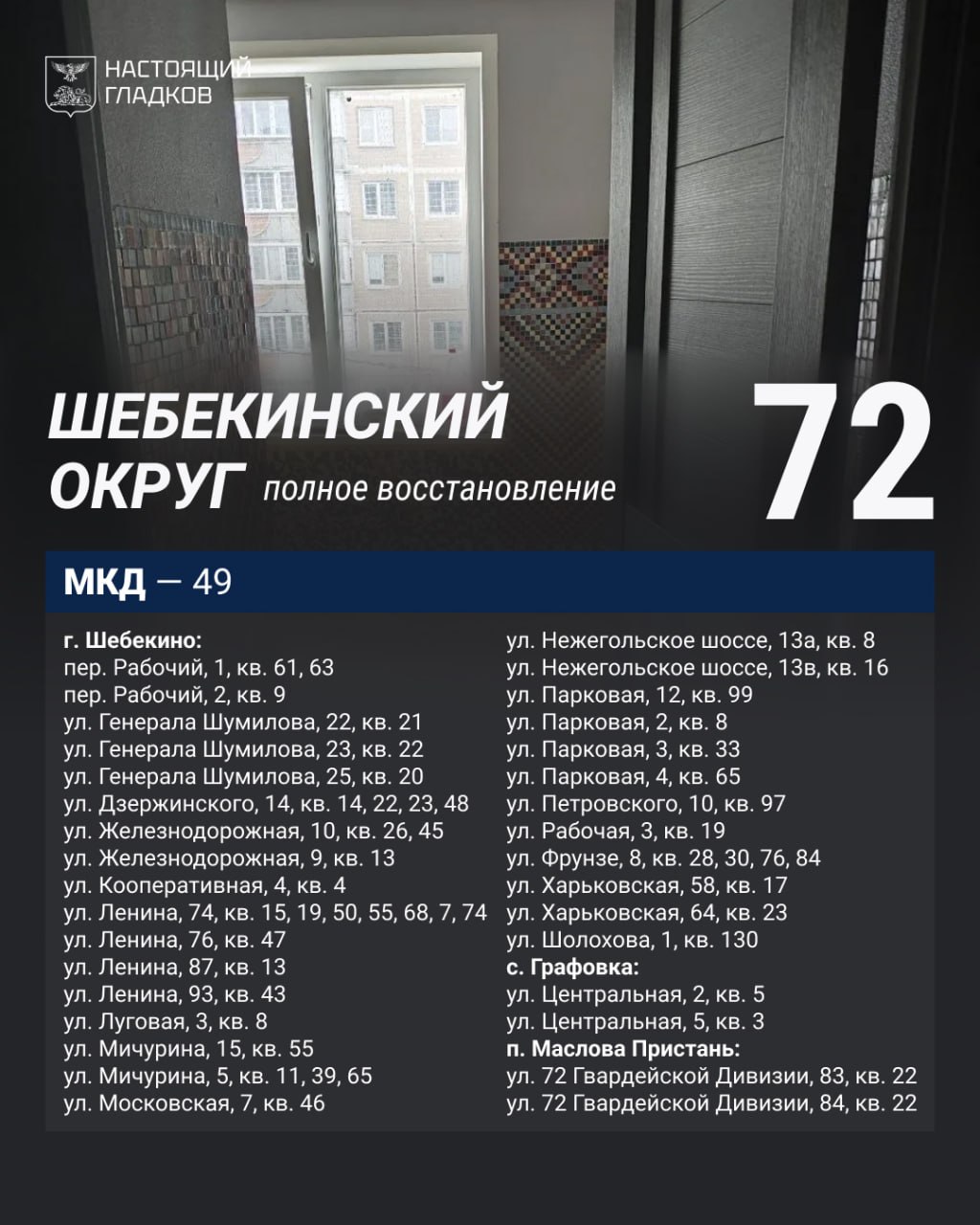 Размещаю список адресов, где, по докладу глав округов, выполнены работы по восстановлению жилья.