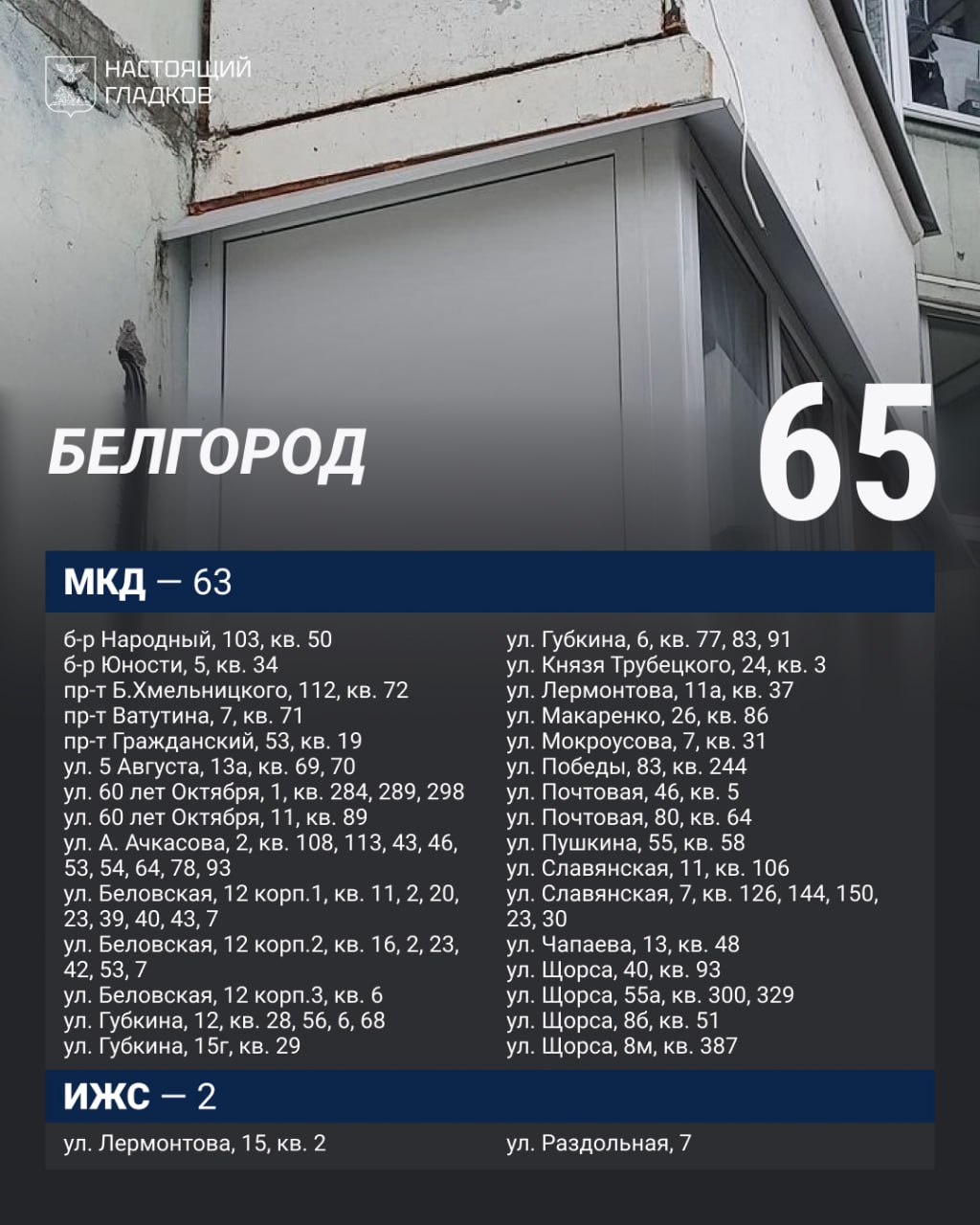 В Белгороде за прошлую неделю завершили 65 объектов. За этот же период повреждения выявлены в 56 жилых помещениях, а также по 27 машинам. В работе 736 жилых объектов.