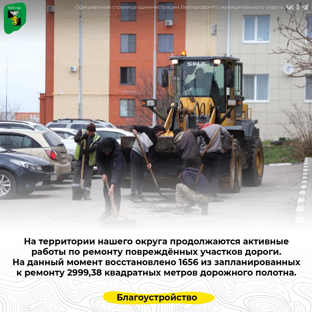 На данный момент восстановлено 1656 из запланированных к ремонту 2999,38 квадратных метров дорожного полотна.