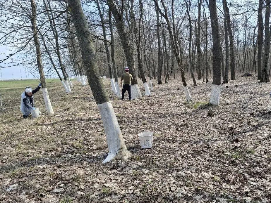 Но на этом работа не закончилась! По традиции, весна – время побелки деревьев, и жители округа активно включились в эту важную работу. Белоснежные стволы теперь украшают не только улицы населённых пунктов, но и лесополосы, придавая им ухоженный и опрятный вид.