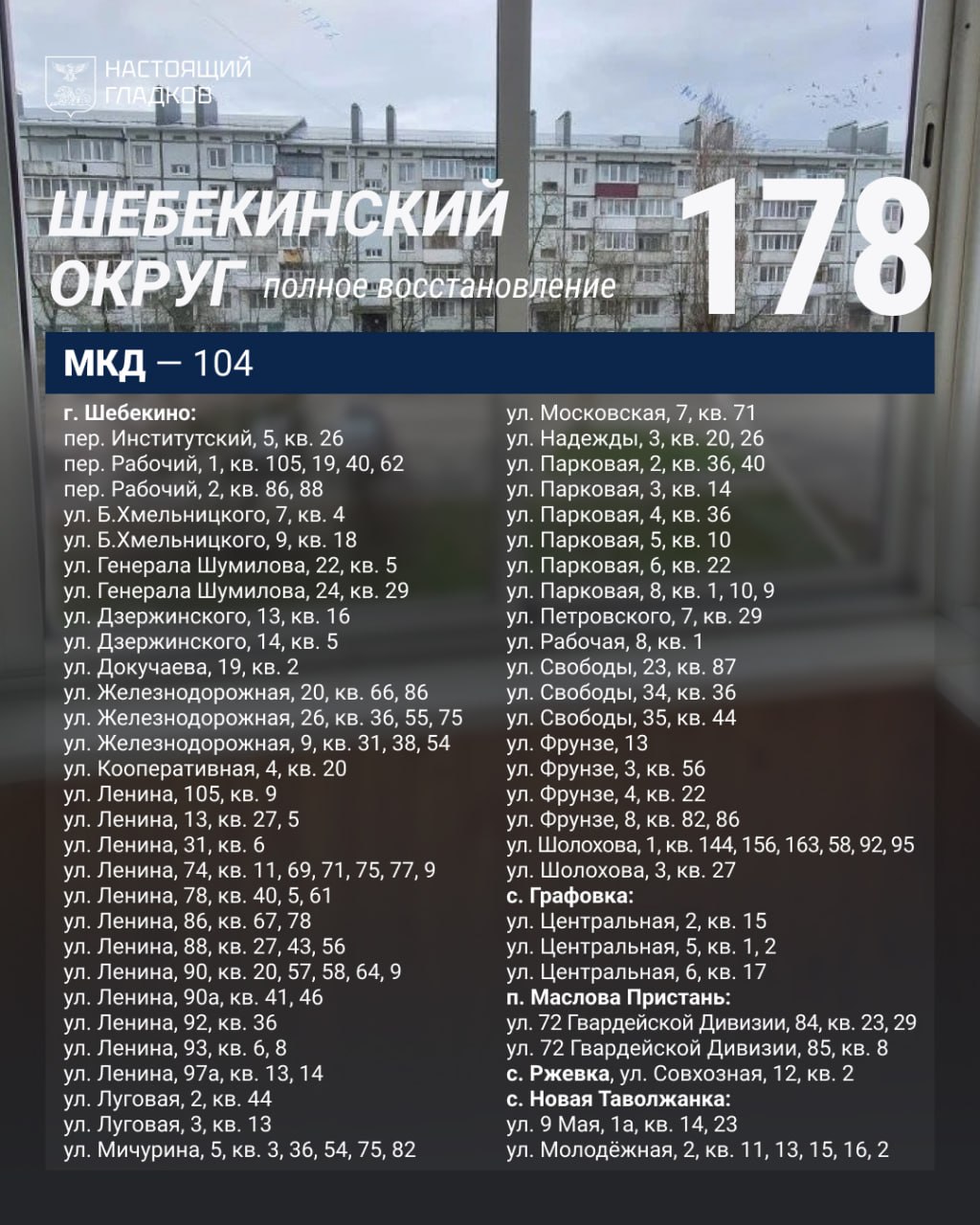 Размещаю список адресов, на которых, по докладу глав округов, выполнены работы по восстановлению жилья.