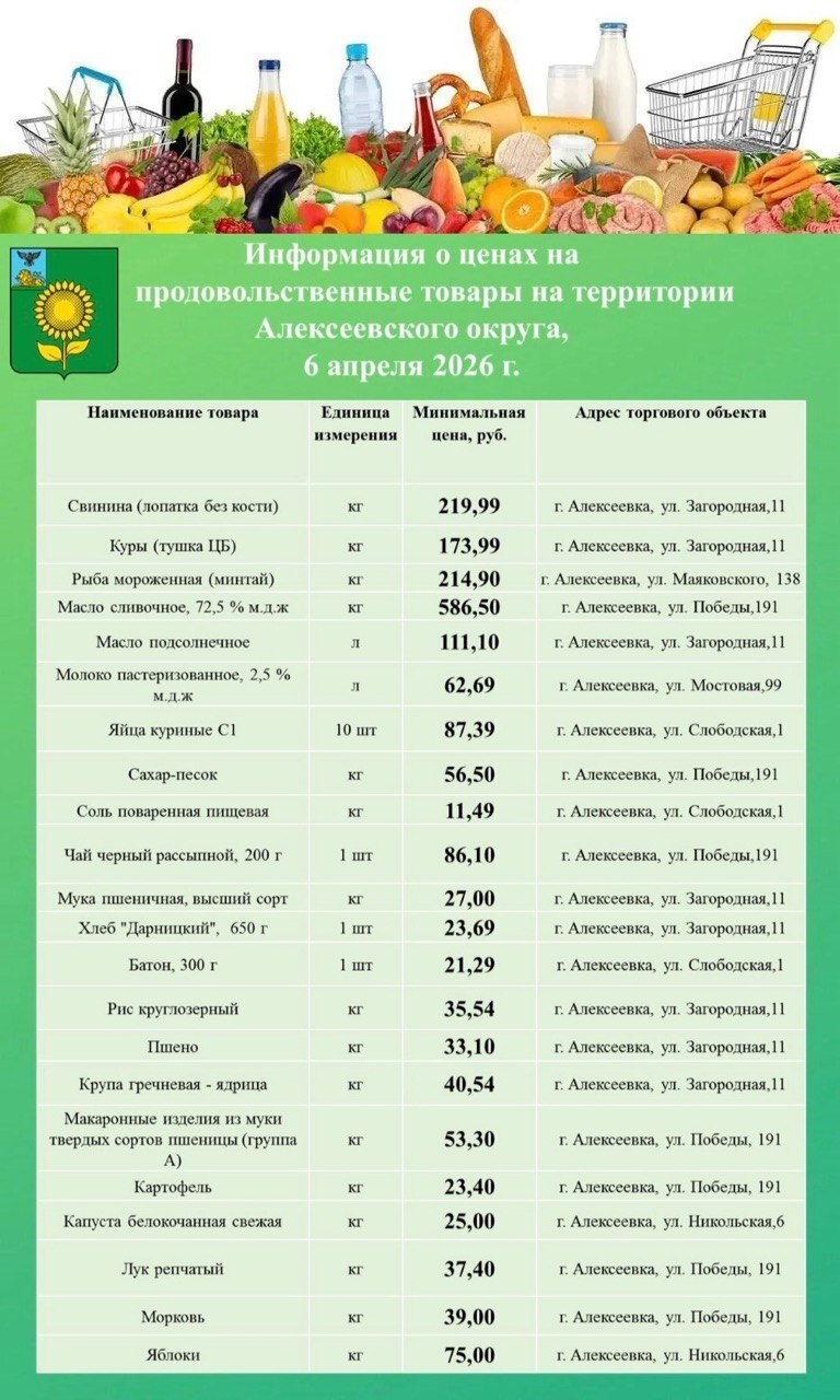 Представляем вашему вниманию обновлённый перечень минимальных цен на продовольственные товары в городе Алексеевка.