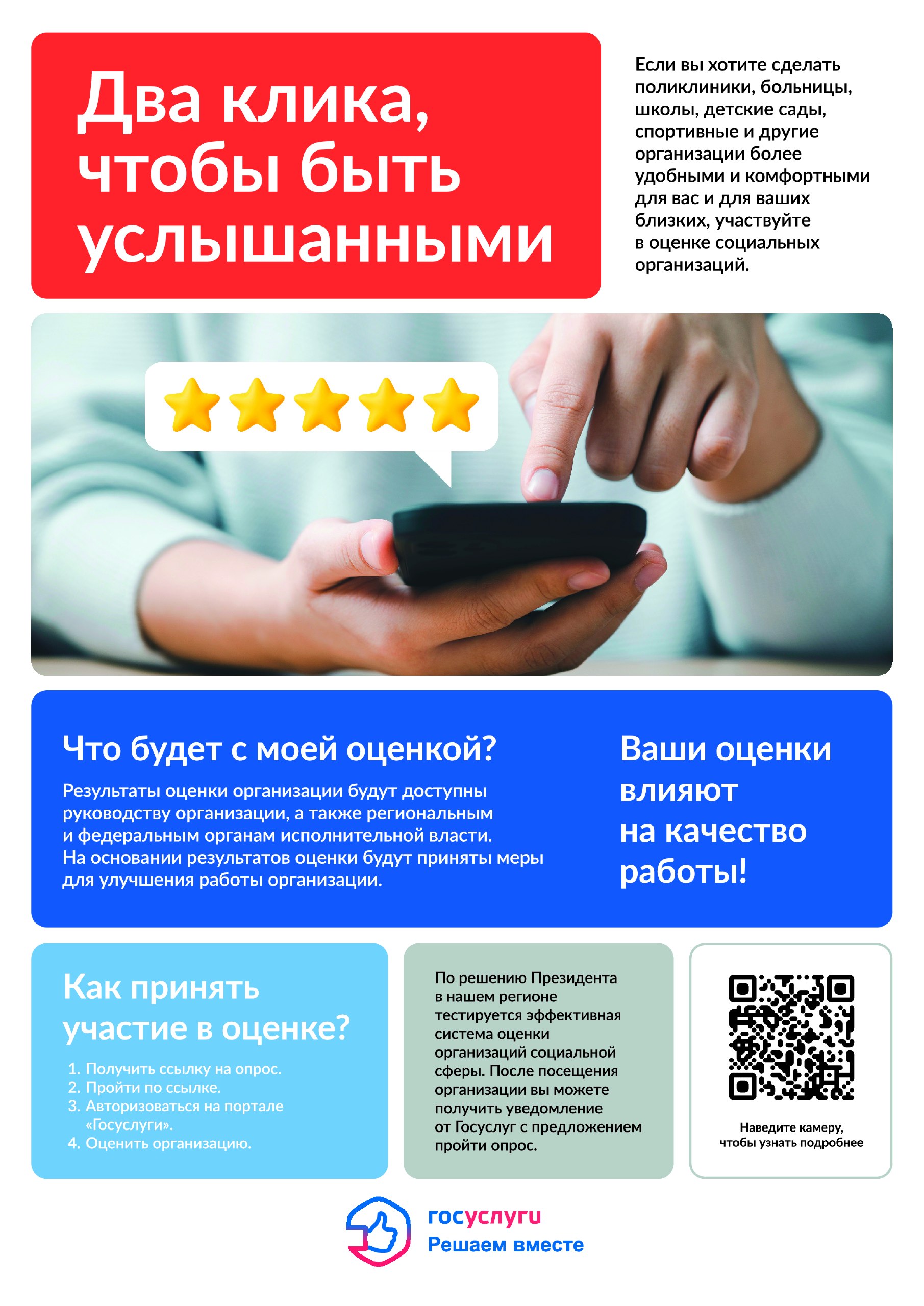 Каждый регион самостоятельно выберет типы организаций для оценки. Граждане смогут высказаться о доступности информации, доброжелательности сотрудников, чистоте и комфорте помещений, наличии безбарьерной среды. Пройти короткий опрос можно на портале «Госуслуги»: уведомления придут в личный кабинет, мобильное приложение и на электронную почту.