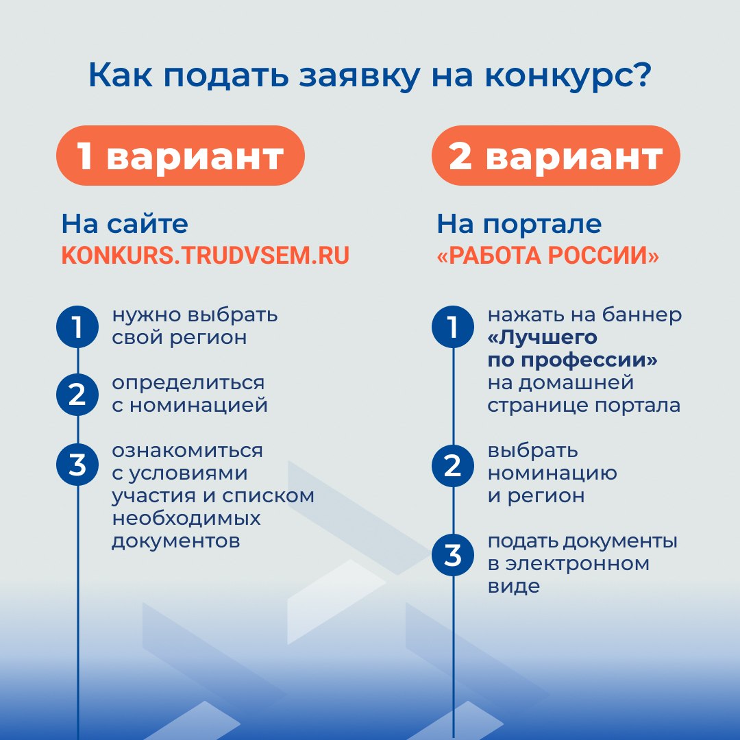 Подать заявку на конкурс «Лучший по профессии» можно на сайте konkurs.trudvsem.ru и на портале «Работа России». Заявку на участие может подать работодатель или сам сотрудник.