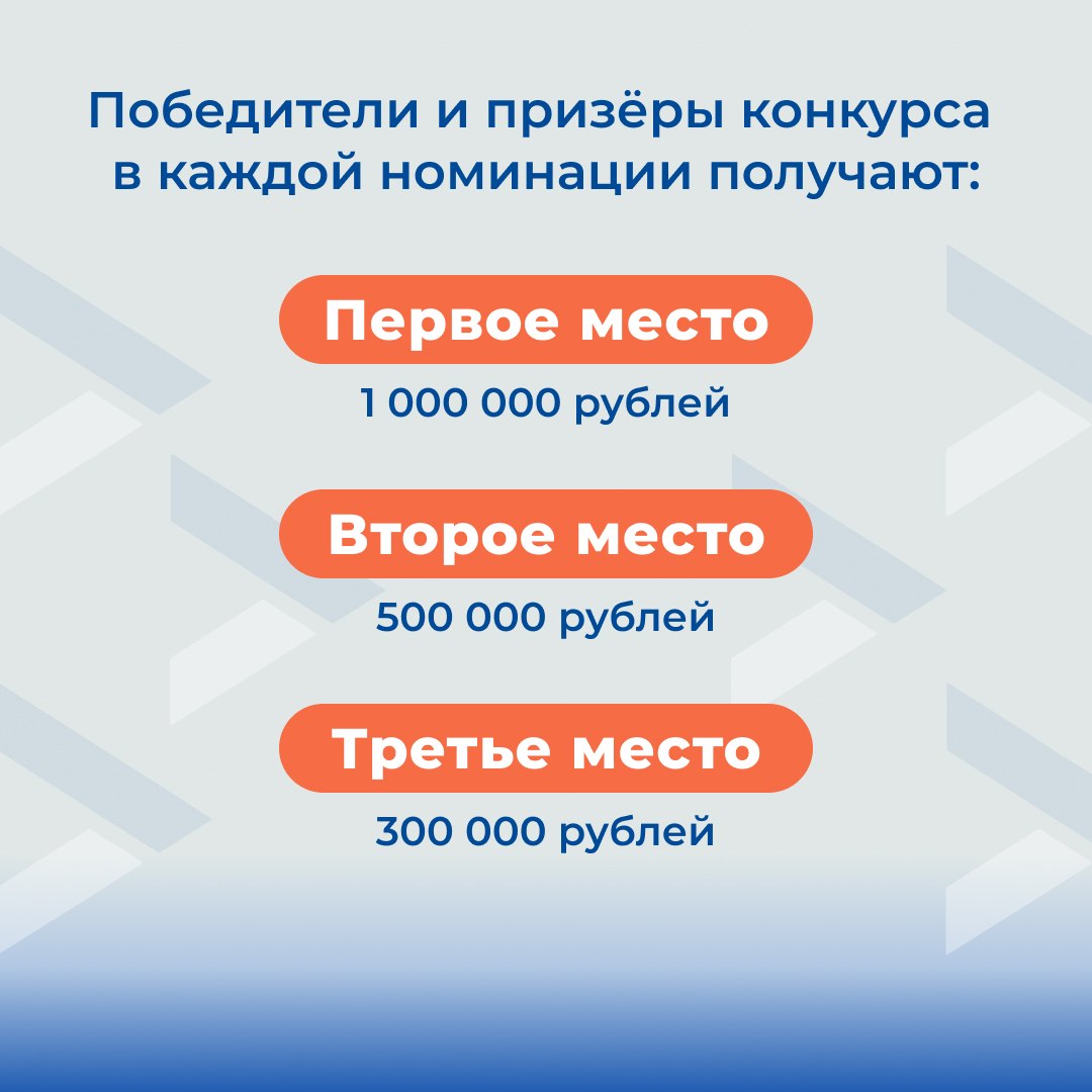 Победители и призёры конкурса в каждой номинации получают один миллион рублей за первое место, 500 тысяч рублей – за второе, 300 тысяч рублей – за третье.