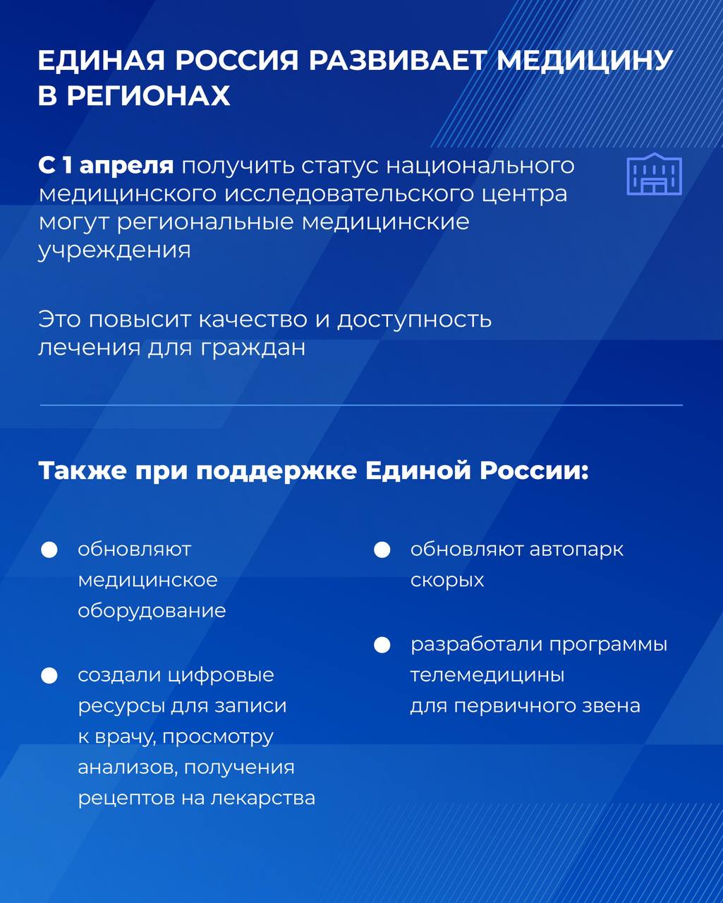 Здоровье — это наша главная ценность. Единая Россия уделяет большое внимание развитию системы здравоохранения в стране. По Народной программе Партии строят и ремонтируют больницы и поликлиники, обновляют медицинское оборудование и автопарк скорых. В отдалённых районах по инициативе Единой России вскоре должны появиться мобильные аптеки.