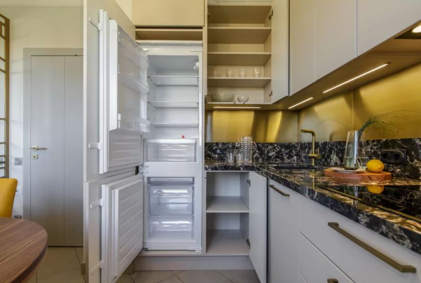 - Плюсы: Скрытие холодильника за фасадом способствует созданию единого стиля, что дает ощущения порядка. Также встроенные модели часто располагаются на удобной высоте, обеспечивая легкий доступ и лучший комфорт в использовании.