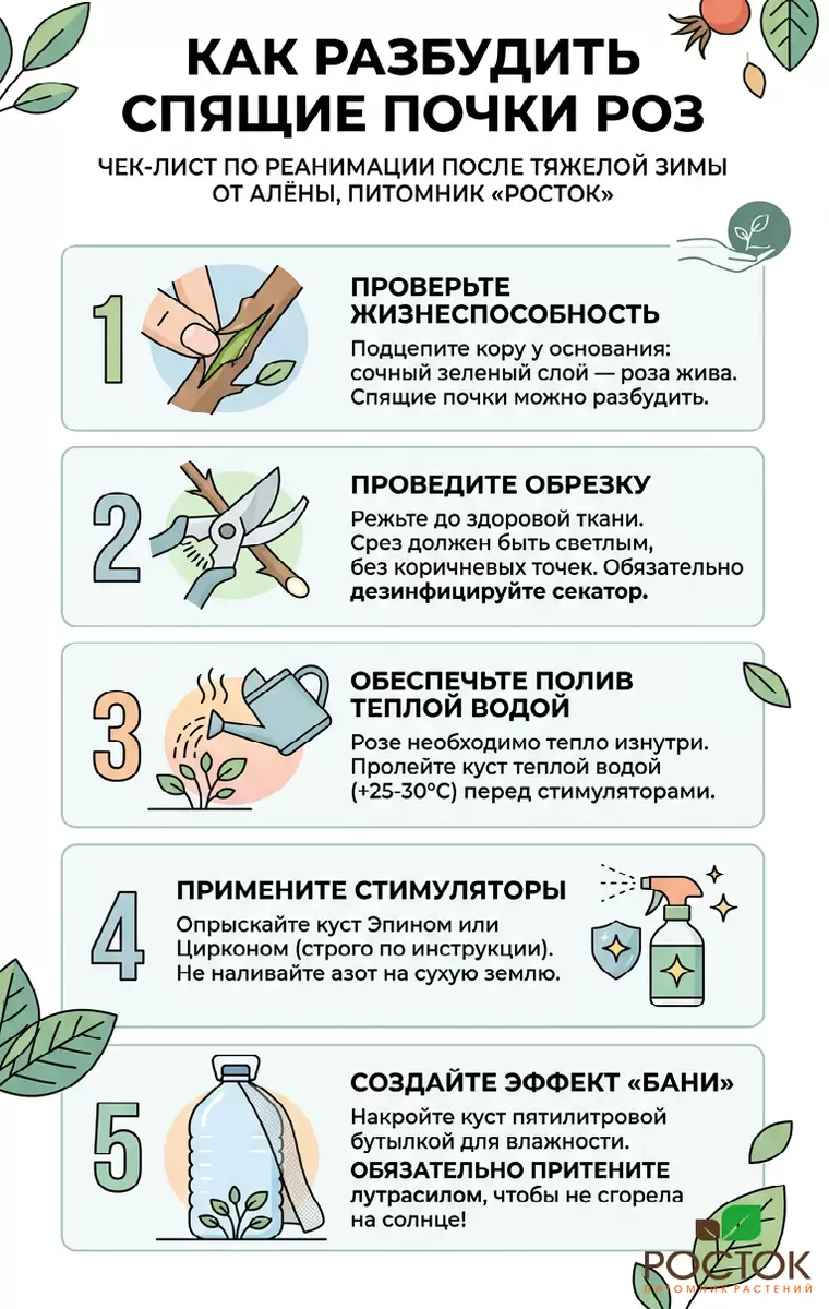 Перед тем как отчаиваться, стоит проверить состояние коры на стволе. Если при аккуратном потирании ногтем вы заметите зеленый слой, значит, надежда есть! Спящие почки — это своего рода запас, который роза прячет на трудные времена, и сейчас вашей задачей будет пробудить их.