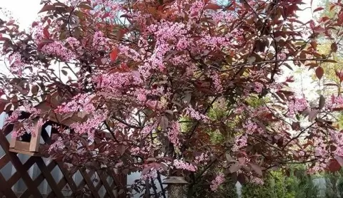 - Черемуха обыкновенная 'Colorata' (Prunus padus 'Colorata'): вырастает до 3–5 метров. Ярко-розовые цветы источают изысканный миндальный аромат. Листья в молодом состоянии пурпурные, летом становятся бронзово-зелеными, а осенью – краснеют. Этот сорт хорошо переносит обрезку.