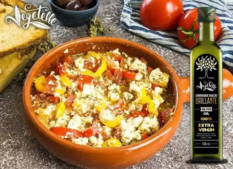 Фету можно нарезать небольшими кубиками или поломать, а затем также выложить на овощную смесь. Всё посыпается орегано и поливается оливковым маслом. Блюдо отправляется в предварительно разогретую до 190 градусов духовку, где запекается в течение 25-30 минут. Как только фета начнёт подрумяниваться, можно смело вынимать блюдо из духовки. Чаще всего фета достаточно солёная, поэтому дополнительную соль добавлять не обязательно — стоит ориентироваться на собственный вкус.
