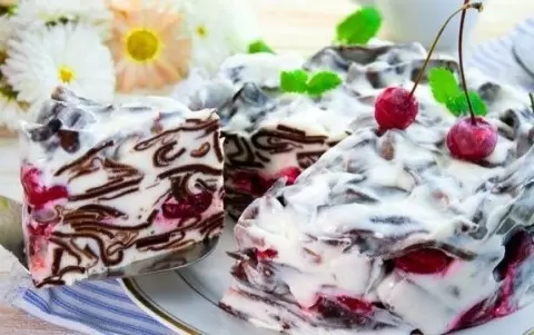 Подготовленную форму для торта застилаем пергаментом и слоями выкладываем смесь из блинчиков и сметаны, чередуя с вишней. После завершения сборки торт помещается в холодильник для полного застывания на 5-6 часов или, для лучшего результата, на ночь. После этого аккуратно снимаем форму и наслаждаемся невероятным десертом.
