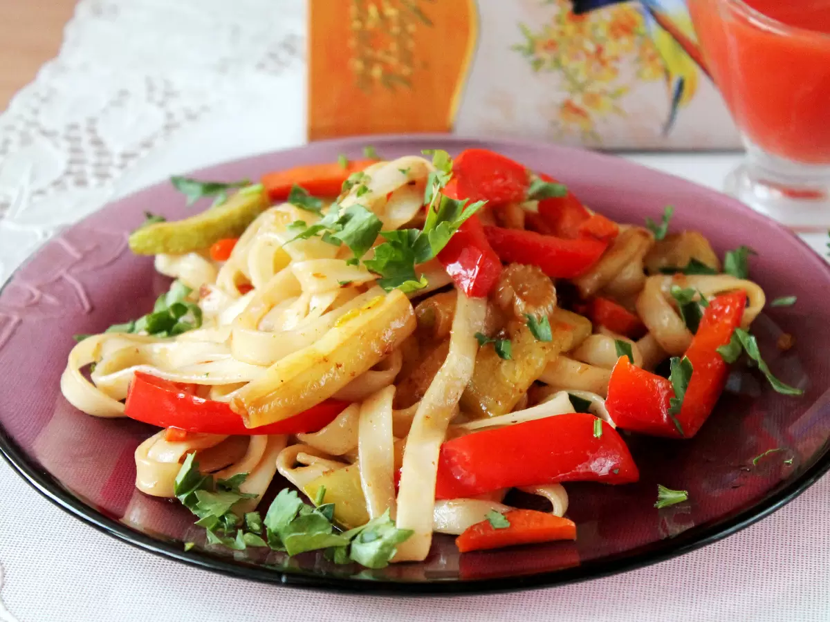 Наступает время свежих сезонных овощей, и это отличная возможность разнообразить свое меню. Легкое и при этом сытное блюдо, которое готовится на скорую руку, сочетает в себе ароматные овощи, чуть-чуть лапши и яркий сладко-кислый соус. Главная задача — не переусердствовать с готовкой: нужно сохранить плотность и хрусткость овощей, чтобы они не превратились в кашу.