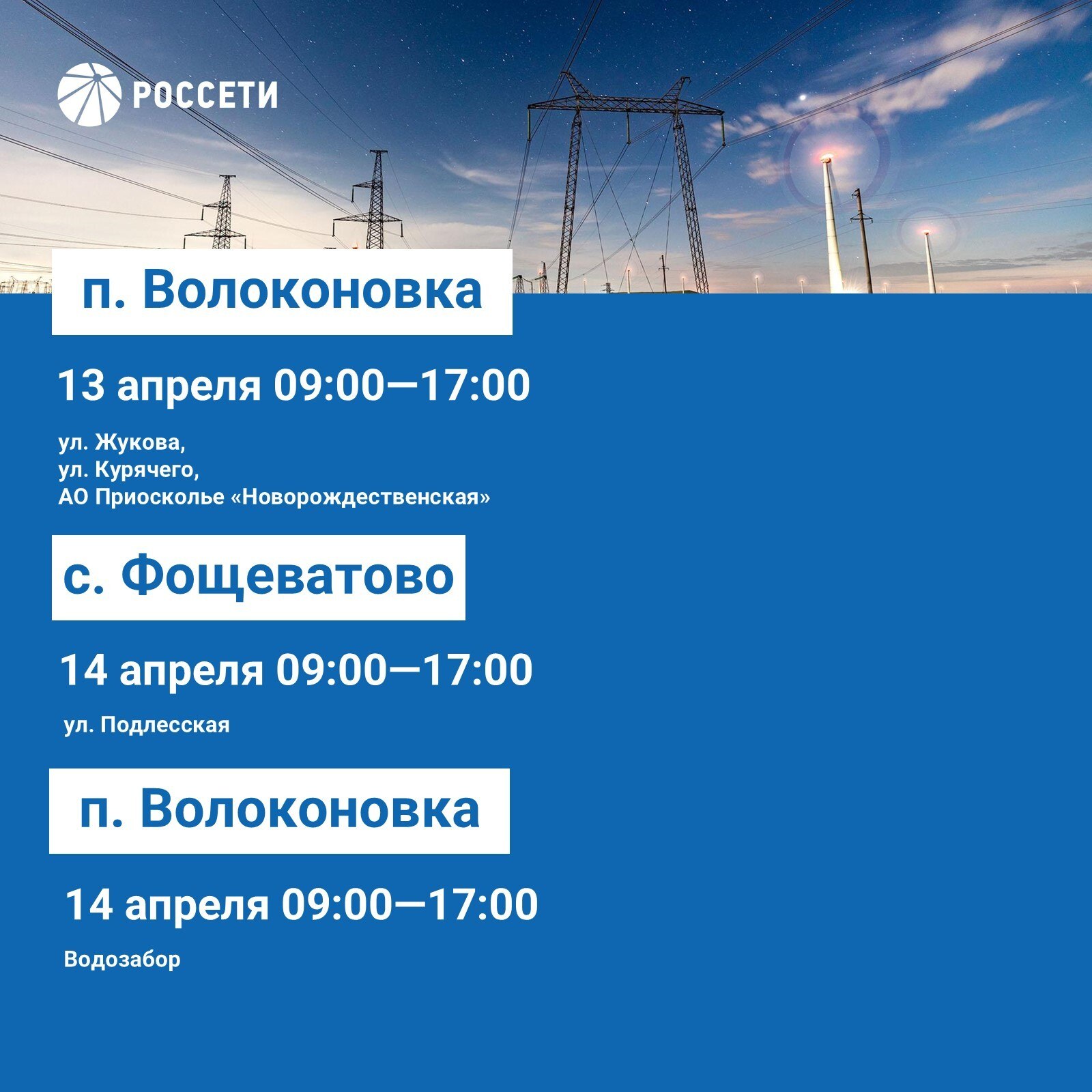 Волоконовский РЭС информирует о плане отключения электроэнергии с 13 по 19 апреля 2026 года