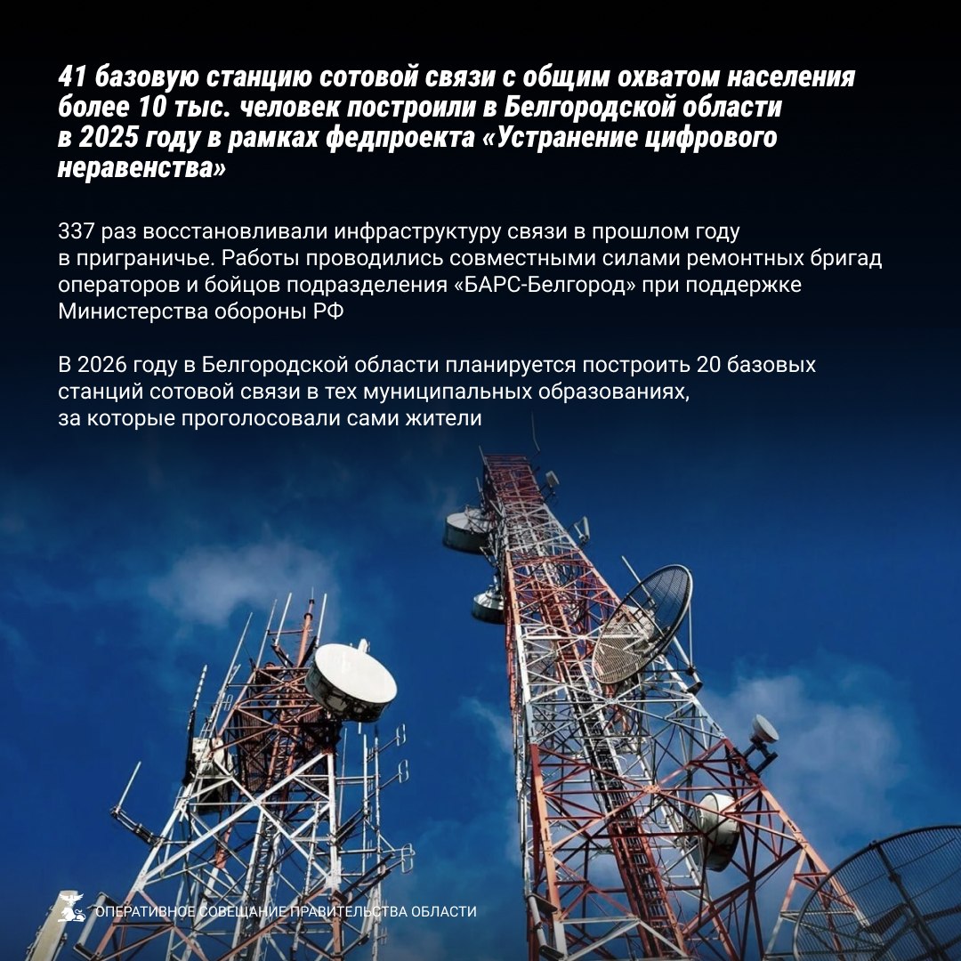 В рамках проекта «Устранение цифрового неравенства» в прошлом году построена 41 базовая станция сотовой связи с охватом более 10 тыс. человек. В приграничных территориях инфраструктура связи восстанавливалась 337 раз