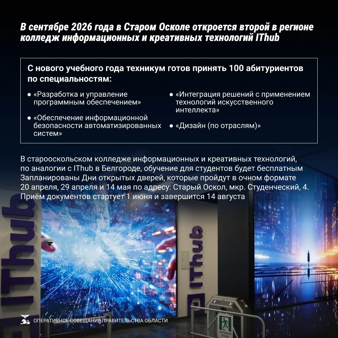 Напомним, начало работы учебного заведения на базе Старооскольского техникума технологий и дизайна запланировано на сентябрь 2026 года.