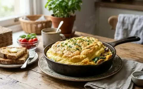 Омлет поднимется и станет высоким; после извлечения из духовки он немного осядет — это нормально.