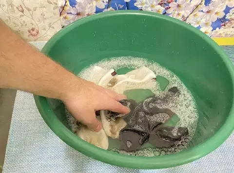 Для создания парникового эффекта таз можно накрыть пищевой пленкой. Это позволит загрязнениям размягчиться и легче поддаваться очистке. Рекомендуется оставить носки в таком растворе на несколько часов.