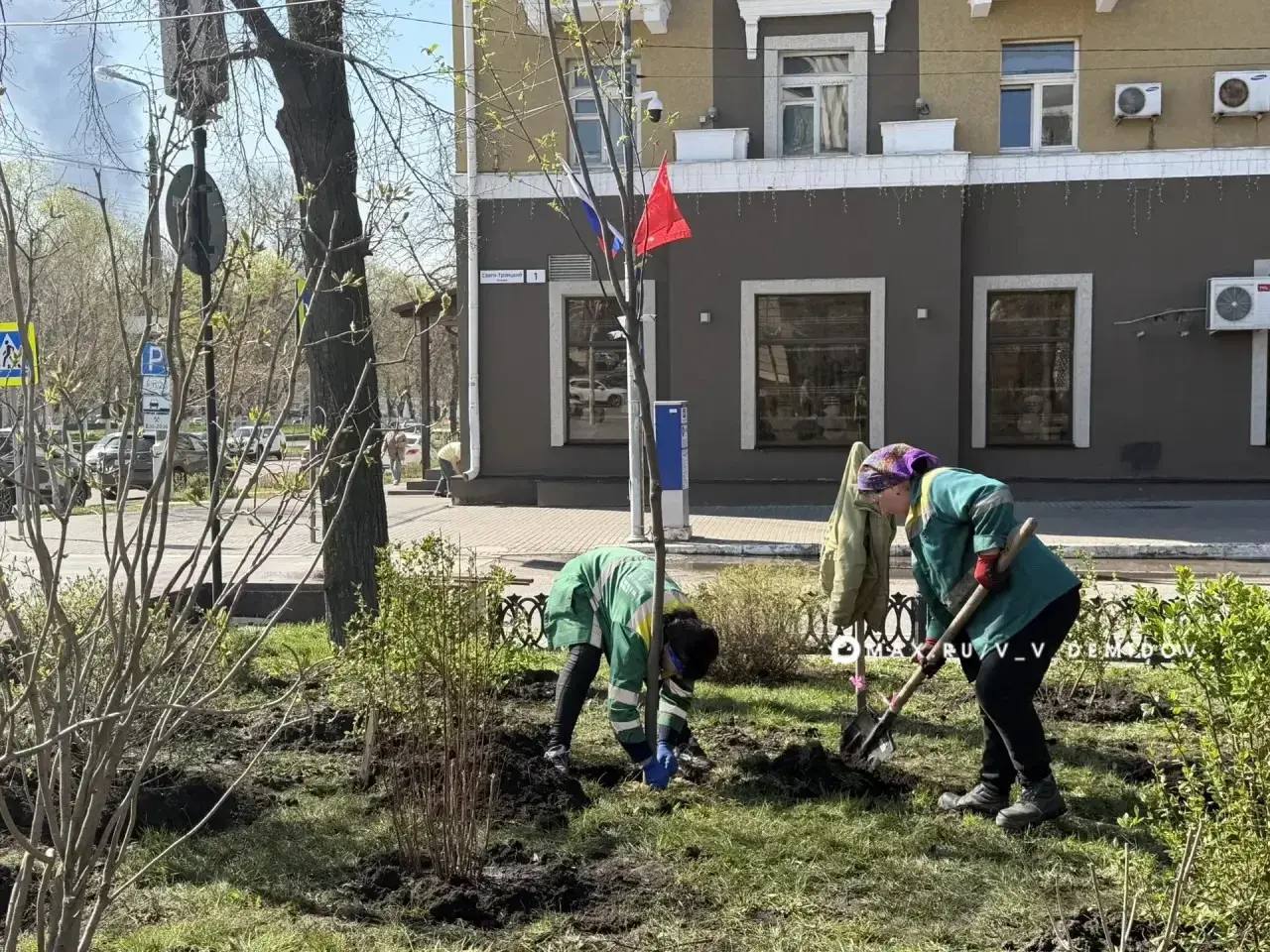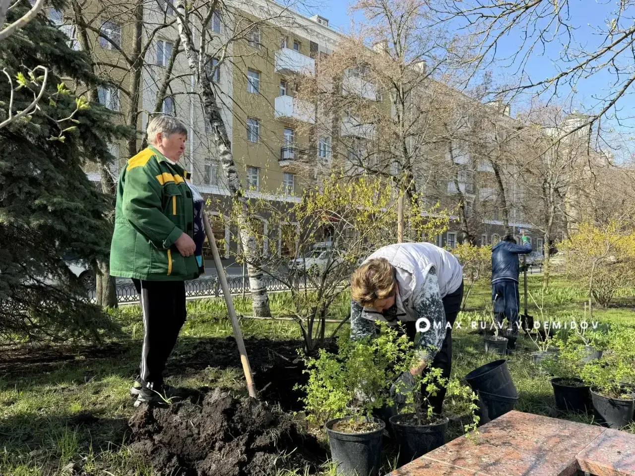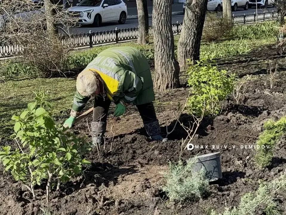 Наши озеленители благоустраивают клумбы у Вечного огня на Соборной площади