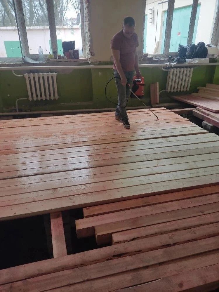 На сегодняшний день во всем здании уже практически выполнен демонтаж, рабочие приступили к устройству деревянных полов и электрики.