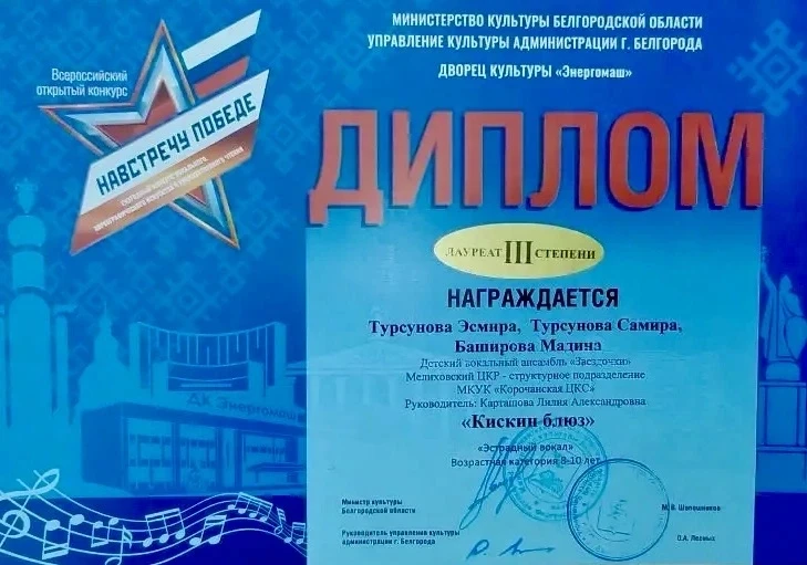 * Лауреаты III степени (трио): Турсунова Эсмира, Турсунова Самира, Баширова Мадина. Яркие номера «Кискин блюз» и «Песня о маме» покорили жюри.