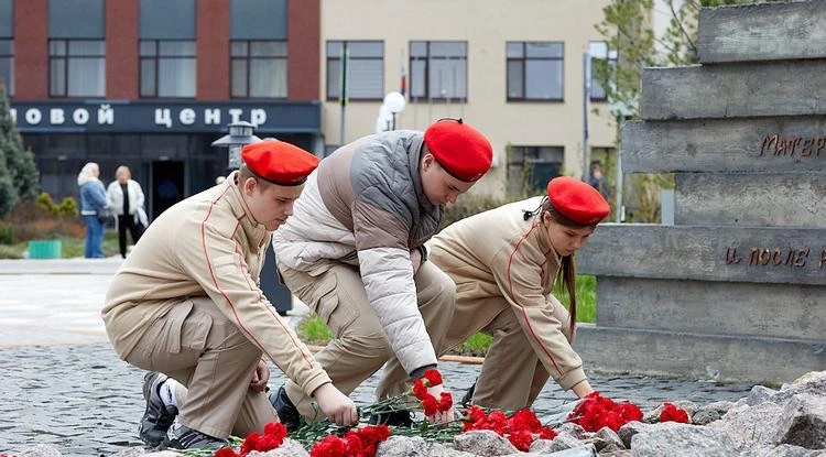 Волонтёры возложили цветы к мемориалу в Камышитовом сквере.