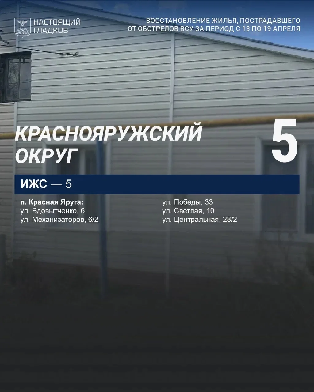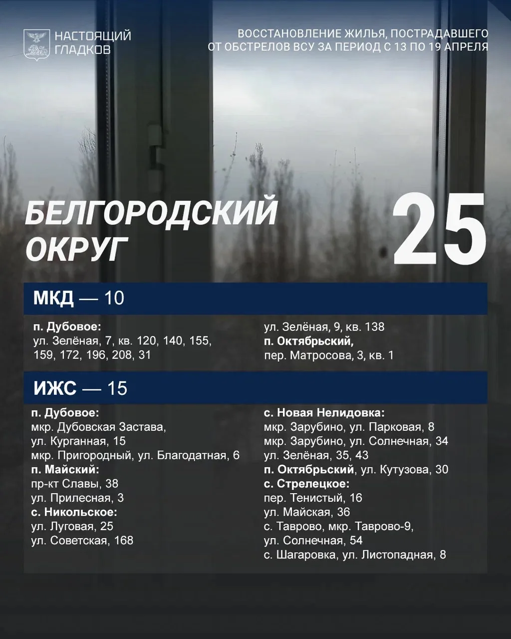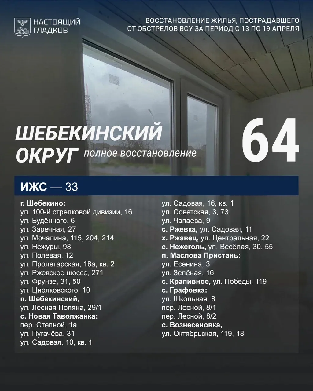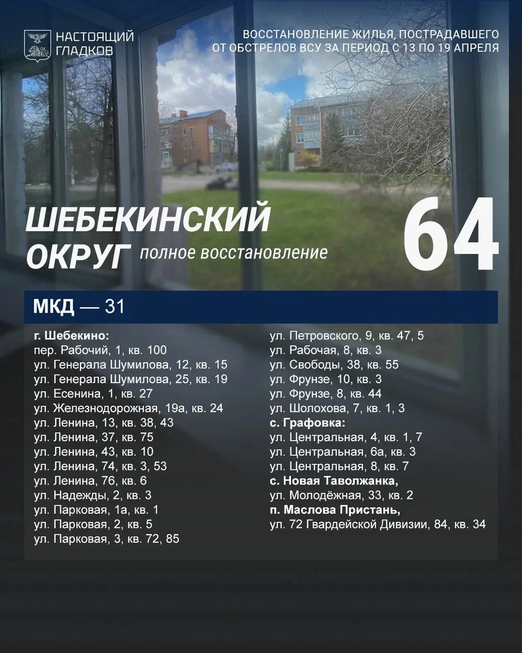 Размещаю список адресов, на которых, по докладу глав округов, выполнены работы по восстановлению жилья.