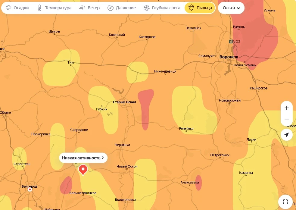 Что касается ольхи, то ситуация неоднородная: в самом Белгороде уровень пыльцы умеренный. Высокая активность – на отдельных территориях, а в Октябрьском, Строителе, Короче, Губкине и некоторых других населённых пунктах она низкая.