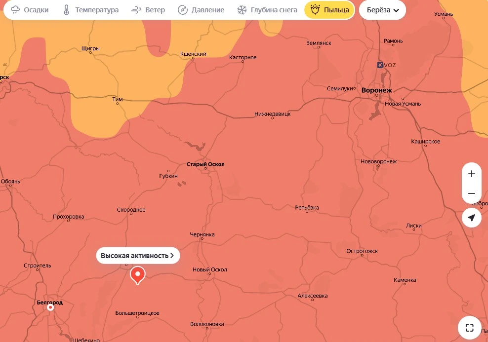 По данным сервиса «Яндекс Карты», уровень пыльцы берёзы в регионе достиг максимальных значений.