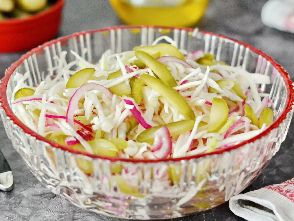 Для этого салата понадобятся всего три ингредиента, которые имеют привычный вид в каждом доме и не требуют специального хранения. Благодаря тому, что салат не содержит майонеза или яиц, он прекрасно сохраняет свою свежесть на протяжении нескольких часов без холодильника. Он подходит даже для жирного мяса, освежая вкус и привнося свои особенные нотки. Если шашлык остыл, он не потеряет своей вкусовой ценности — салат останется сочным и аппетитным, не уступая в качестве привычному набору из помидоров и огурцов.