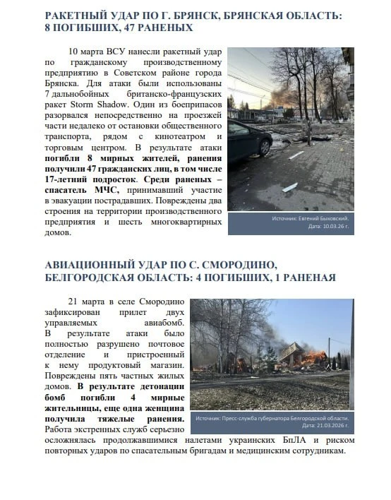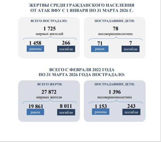 Цифры об агрессии врага за первый квартал 2026 года представил посол по особым поручениям МИД России Родион Мирошник. Всего за это время при ударах со стороны противника погибли 266 мирных жителей, ранены 1 459 человек, из них – 71 ребёнок.