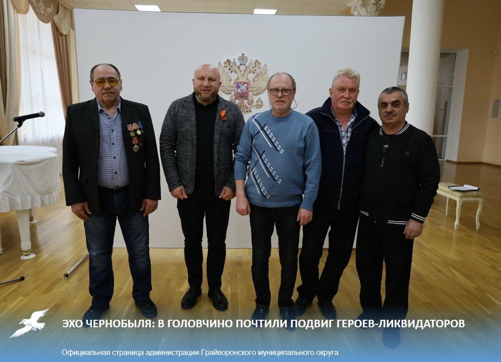 Слова признательности в адрес ветеранов-чернобыльцев прозвучали от главы Грайворонского округа Дмитрия Панкова и главы Головчинской сельской территории Ирины Поляковой. Главными героями встречи стали непосредственные участники ликвидации — наши земляки: Владимир Заднепрянский, Василий Шалимов, Гоча Купрадзе и Сергей Карпушин.