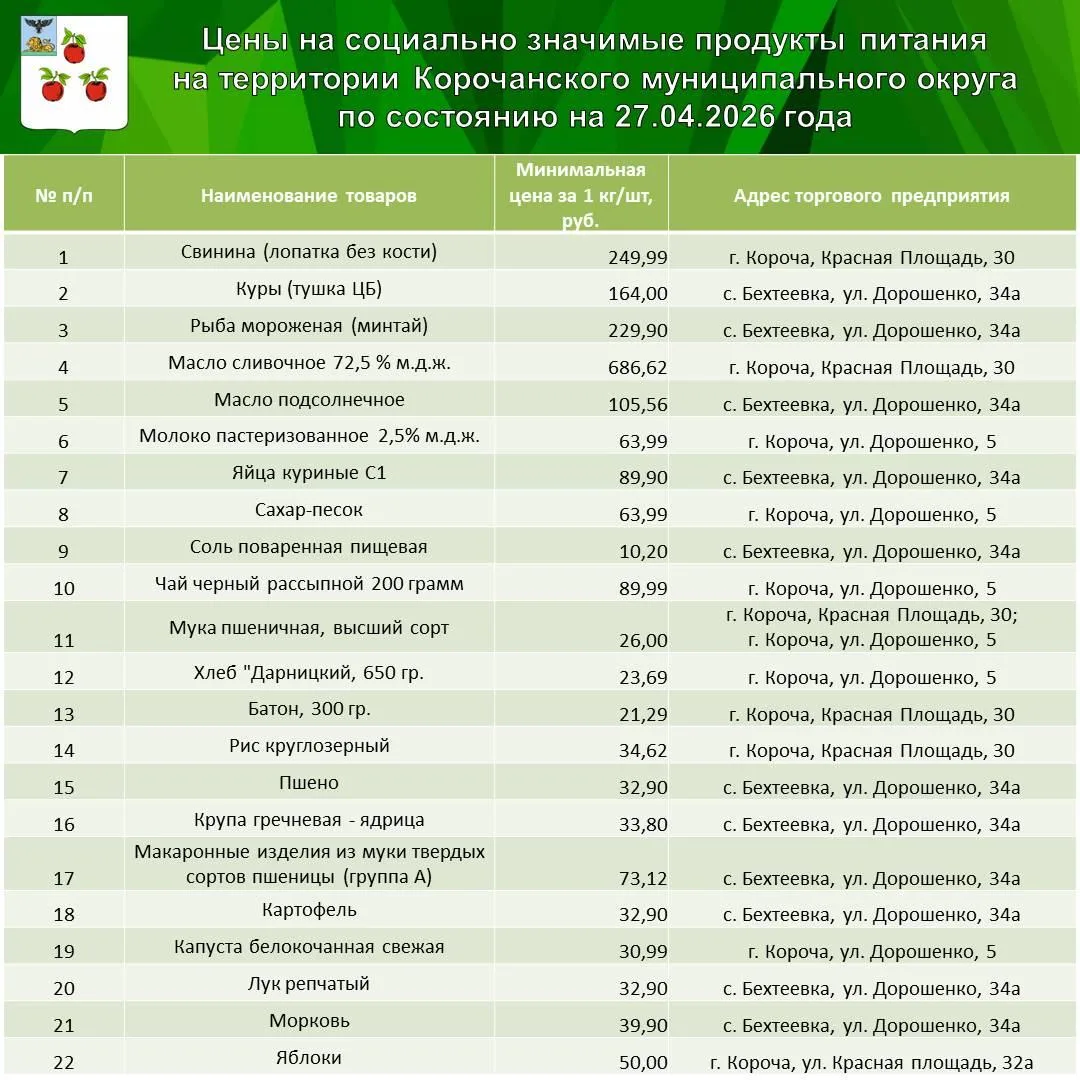 В карточке указаны минимальные розничные цены, зафиксированные на мясо, рыбу, яйца, крупы, молоко, хлеб и овощи, а также адреса торговых предприятий, где их можно приобрести.