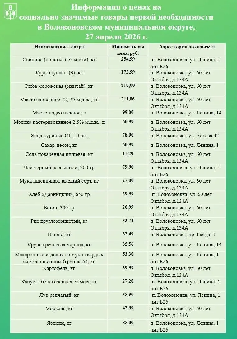 Уважаемые волоконовцы!Информируем вас о ценах на продовольственные товары из базовой потребительской корзины, складывающихся в нашем муниципалитете на сегодняшний день.