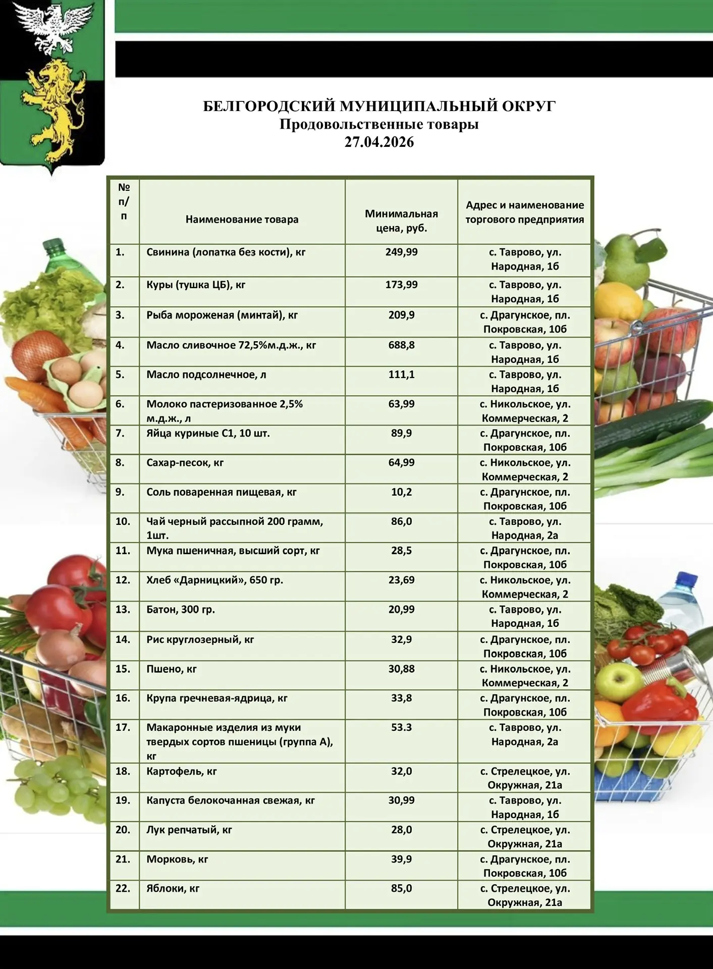 Уважаемые волоконовцы!Информируем вас о ценах на продовольственные товары из базовой потребительской корзины, складывающихся в нашем муниципалитете на сегодняшний день.