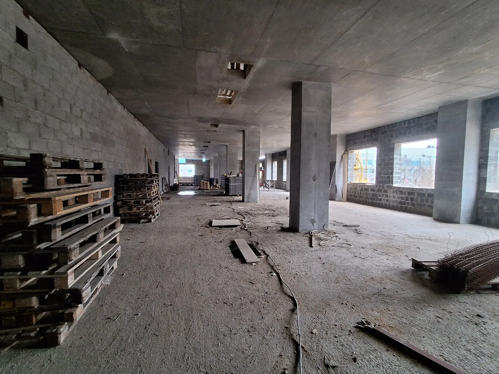 В блоке «А» в полном объемы выполнен каркас здания, снаружи завершается установка окон и витражей, ведется устройство фасада и кровли. Что касаемо внутренних работ, начато оштукатуривание стен, продолжается устройство чернового пола цокольного этажа и монтаж внутренних инженерных коммуникаций.