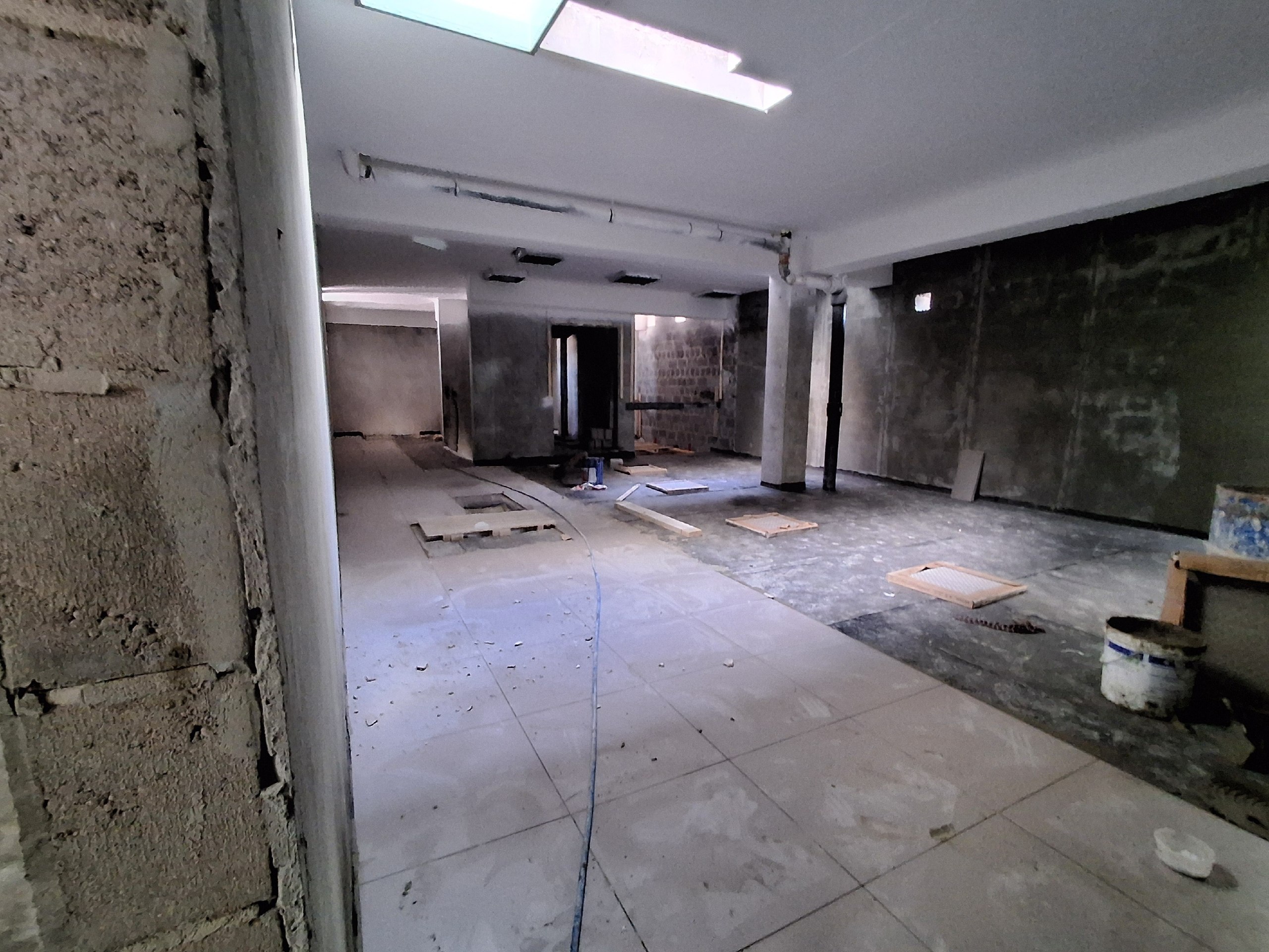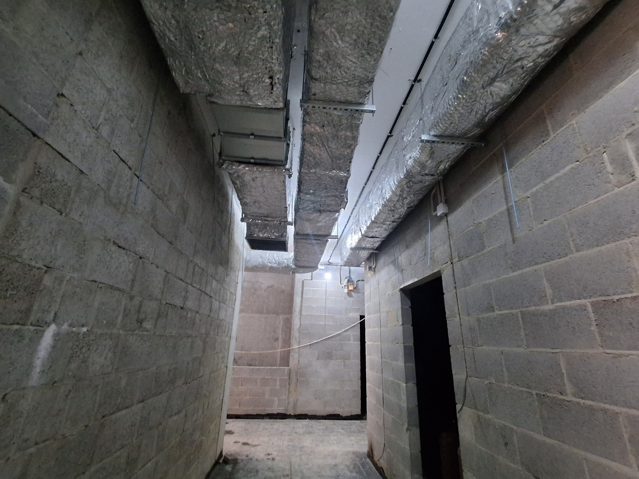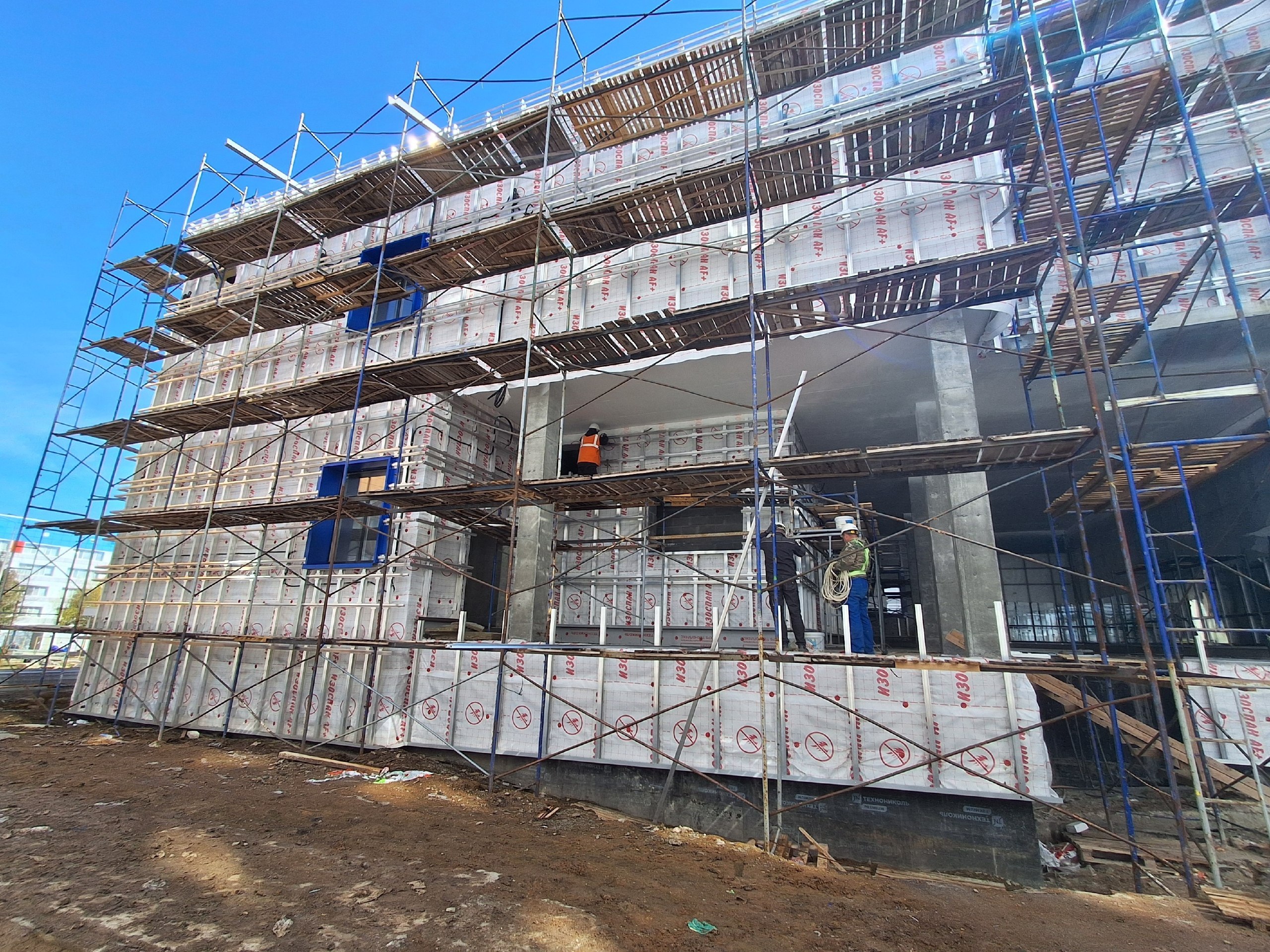 В блоке «А» в полном объемы выполнен каркас здания, снаружи завершается установка окон и витражей, ведется устройство фасада и кровли. Что касаемо внутренних работ, начато оштукатуривание стен, продолжается устройство чернового пола цокольного этажа и монтаж внутренних инженерных коммуникаций.