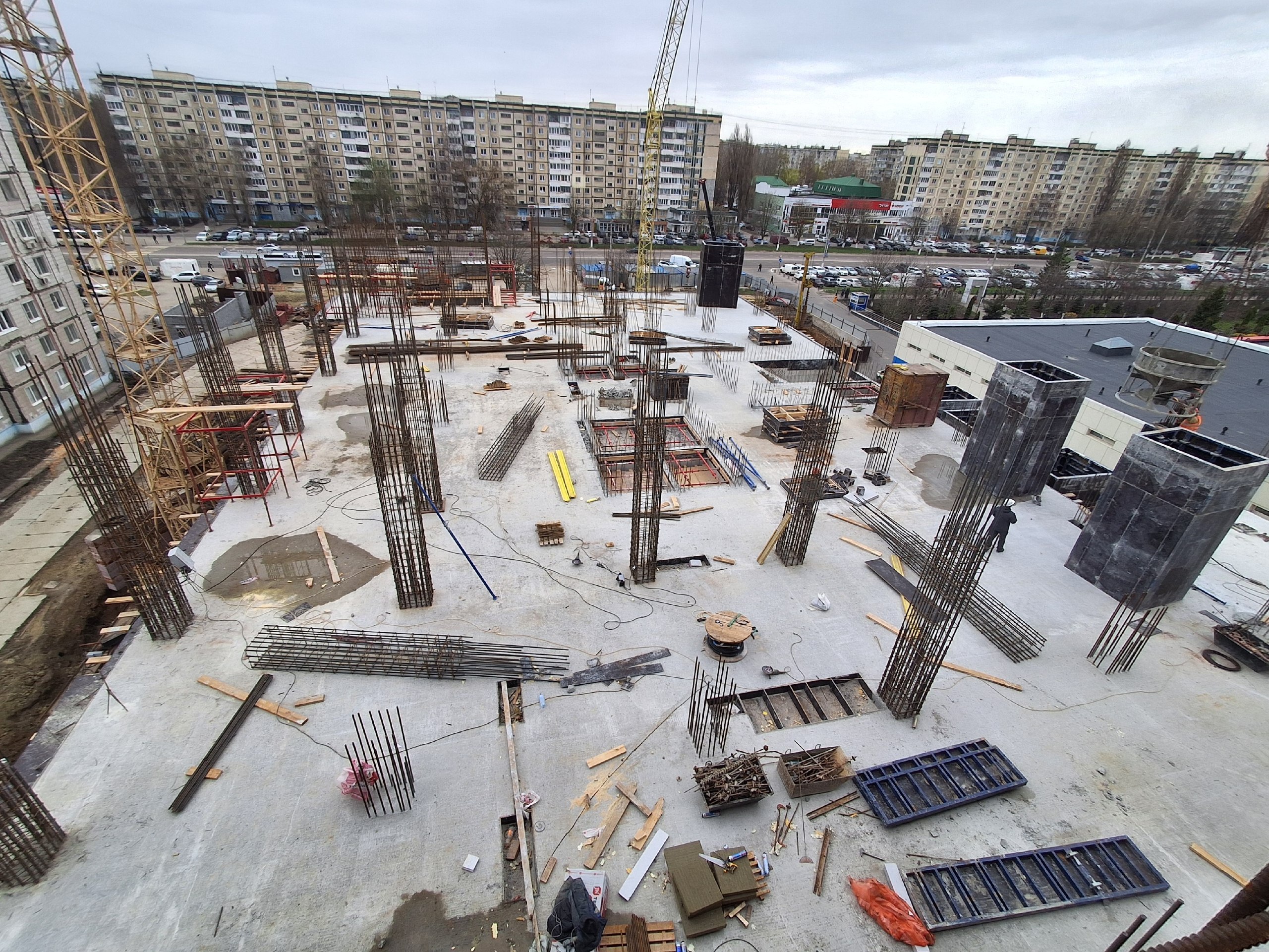 В блоке «Б» в высокой степени готовности наружная гидроизоляция цоколя, утепление стен и устройство чернового пола цокольного этажа. Также строители осуществляют работы по устройству стен и перегородок первого, второго, третьего и цокольного этажей, выполняют монтаж колонн и перекрытий четвертого, пятого и шестого этажей, приступили к устройству колонн седьмого этажа.