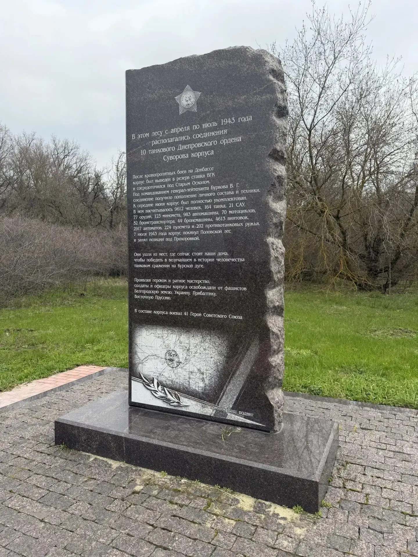 Двухметровая гранитная стела установлена в Старом Осколе на окраине Половского леса, на месте дислокации воинского подразделения. Весной 1943 года здесь укрывались танкисты после 900-километрового прохода по Донбассу. Позже участвовали в сражениях на Курской дуге, освобождали левобережную Украину, Прибалтику, Восточную Пруссию.