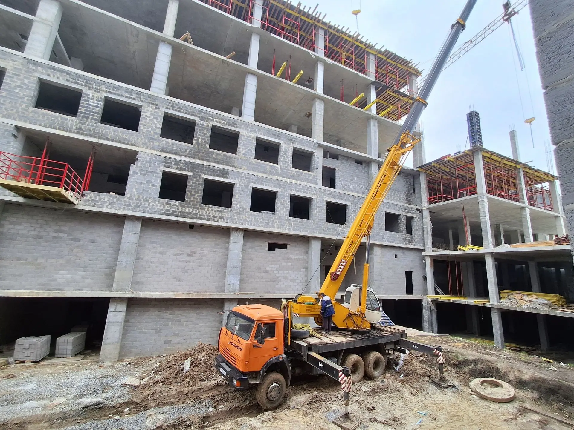 В блоке «Б» практически выполнены наружная гидроизоляция цоколя, утепление стен и устройство чернового пола цокольного этажа. Также строители осуществляют работы по устройству стен и перегородок первого, второго, третьего и цокольного этажей, выполняют монтаж колонн и перекрытий четвертого, пятого и шестого этажей, приступили к устройству колонн седьмого этажа.