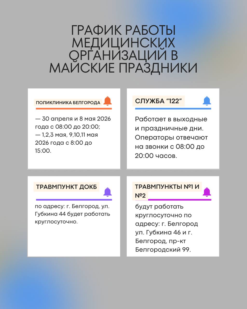 Поликлинические отделения городской поликлиники города Белгорода 30 апреля и 8 мая работают с 08:00 до 20:00, 1, 2, 3 мая, 9,10,11 мая работают с 8:00 до 15:00.
