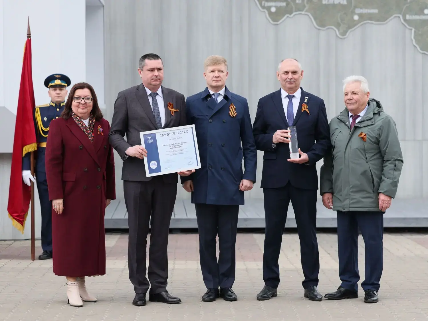 Свидетельство и почётный знак исполняющему обязанности директора филиала Алексею Ботвиньеву и председателю первичной профсоюзной организации филиала Анатолию Андросовичу вручили первый заместитель губернатора Белгородской области Илья Пономарев и председатель областного объединения профсоюзов Николай Шаталов.