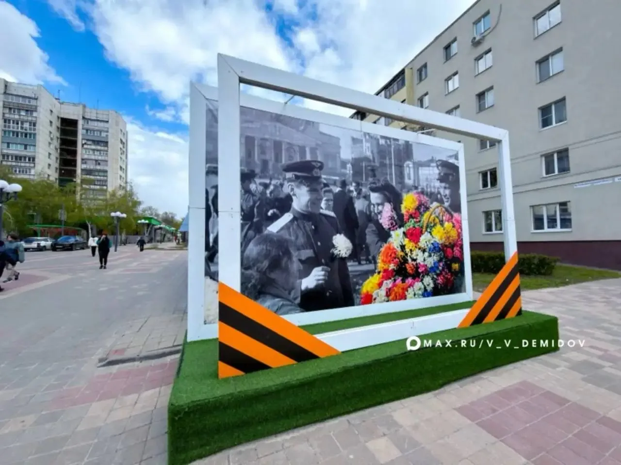 — у солнечных часов — объёмные кубы с фотографиями и символами Победы;